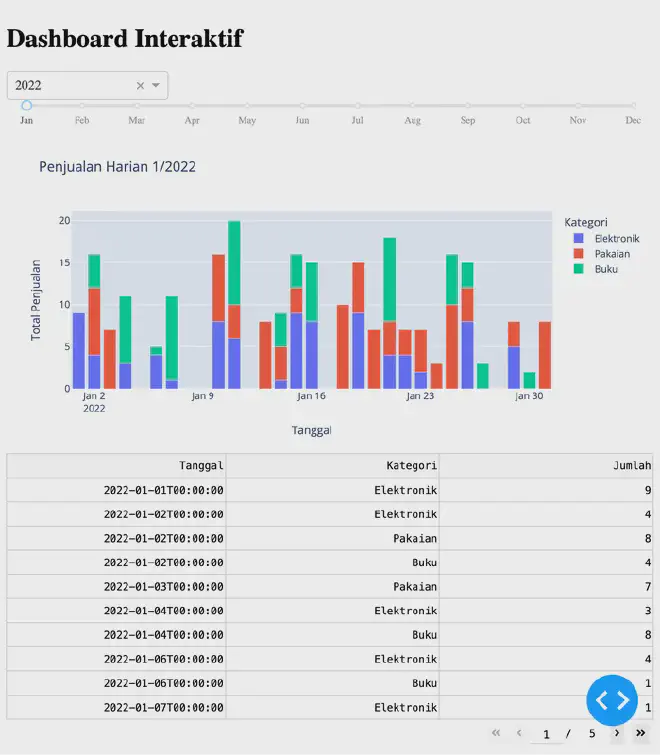 Pada bagian ini kita akan membuat drop down dan slider untuk mengontrol tampilan grafik. Dropdown berisi tahun (2022 dan 2023), sedangkan slider berisi bulan (Jan, Feb, Mar, …, Des). Sedangkan grafik berisi grafik penjualan harian dalam bentuk stacked bar dengan coloring Kategori pada bulan dan tahun yang sesuai dengan di dropdown dan slider. Jika slider dan dropdown berubah, maka grafik penjualan harian ikut berubah.
