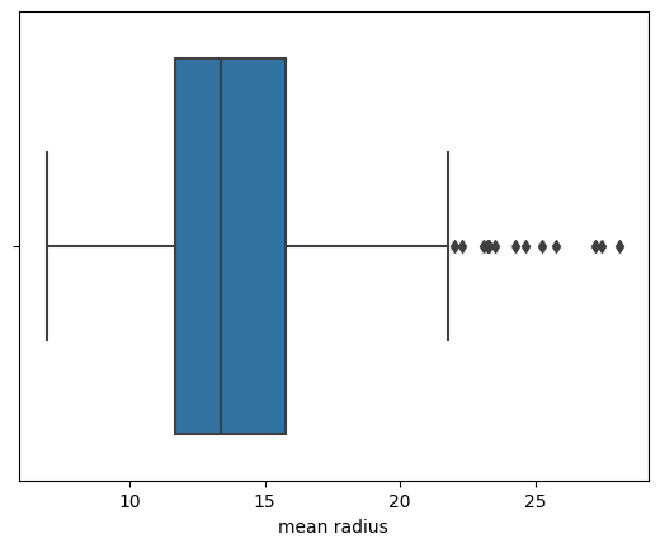 Pada kode berikut, kita akan melakukan deteksi outlier pada fitur “mean radius”.